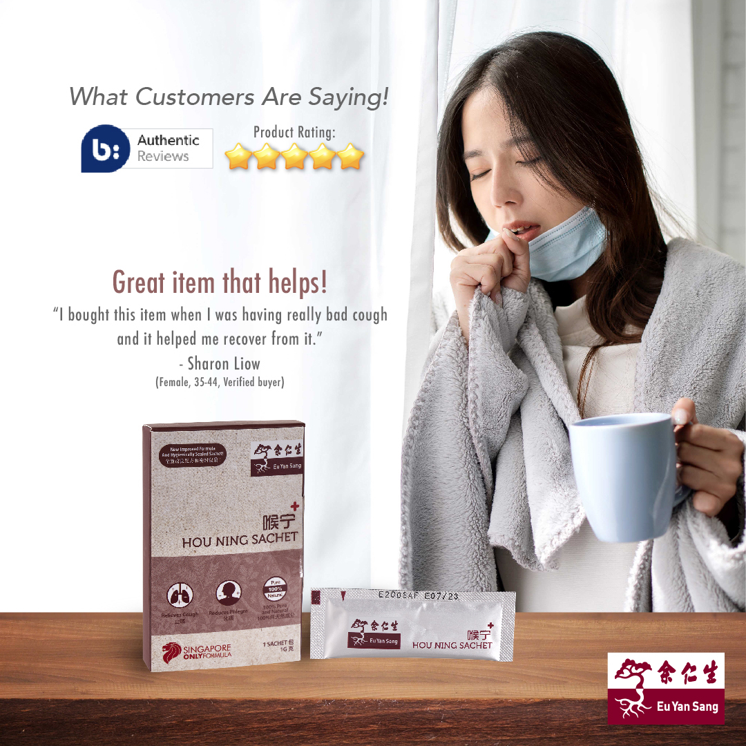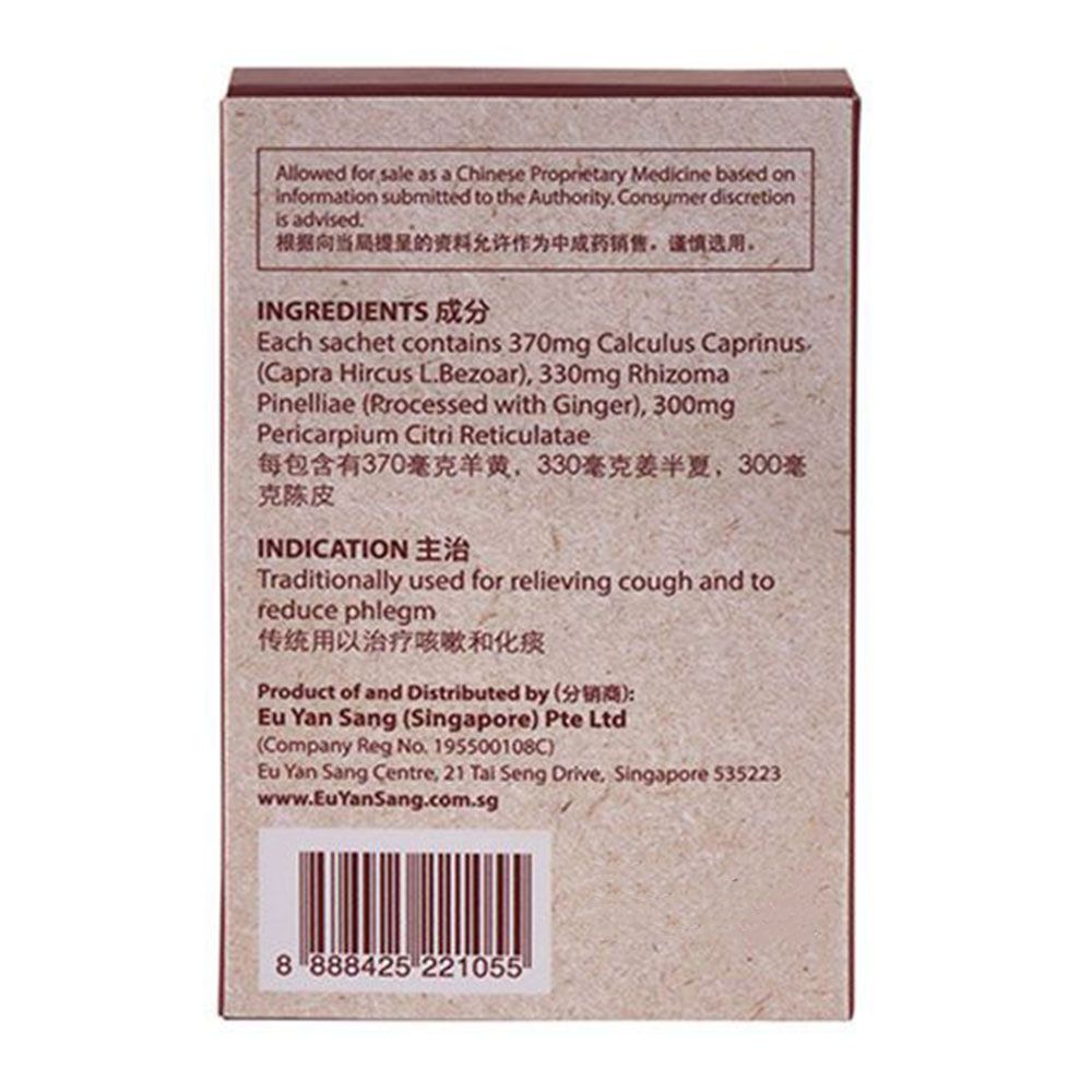 Each sachet contains 370mg Calculus Caprinus (Capra Hircus L.Bezoar), 330mg Rhizoma Pinelliae (Processed with Ginger), 300mg Pericarpium Citri Reticulatae