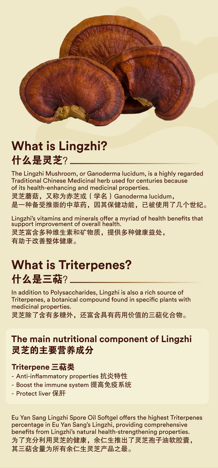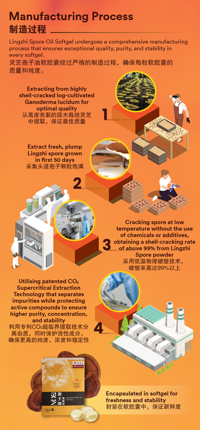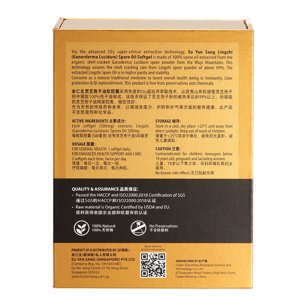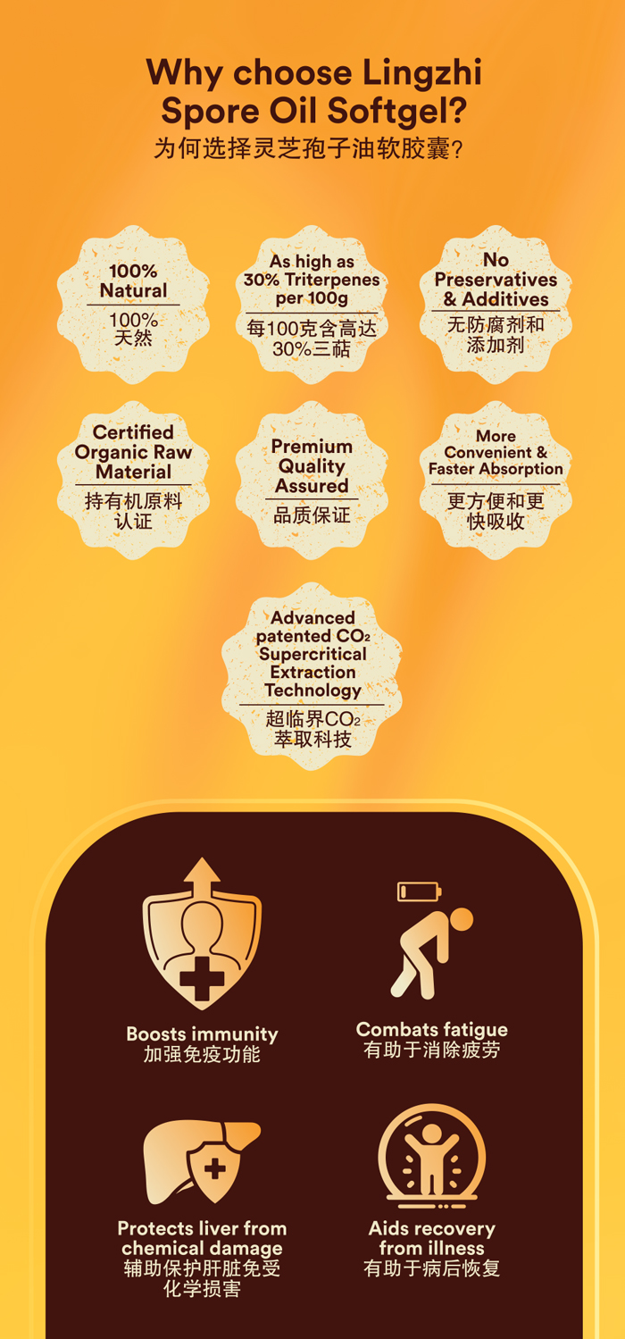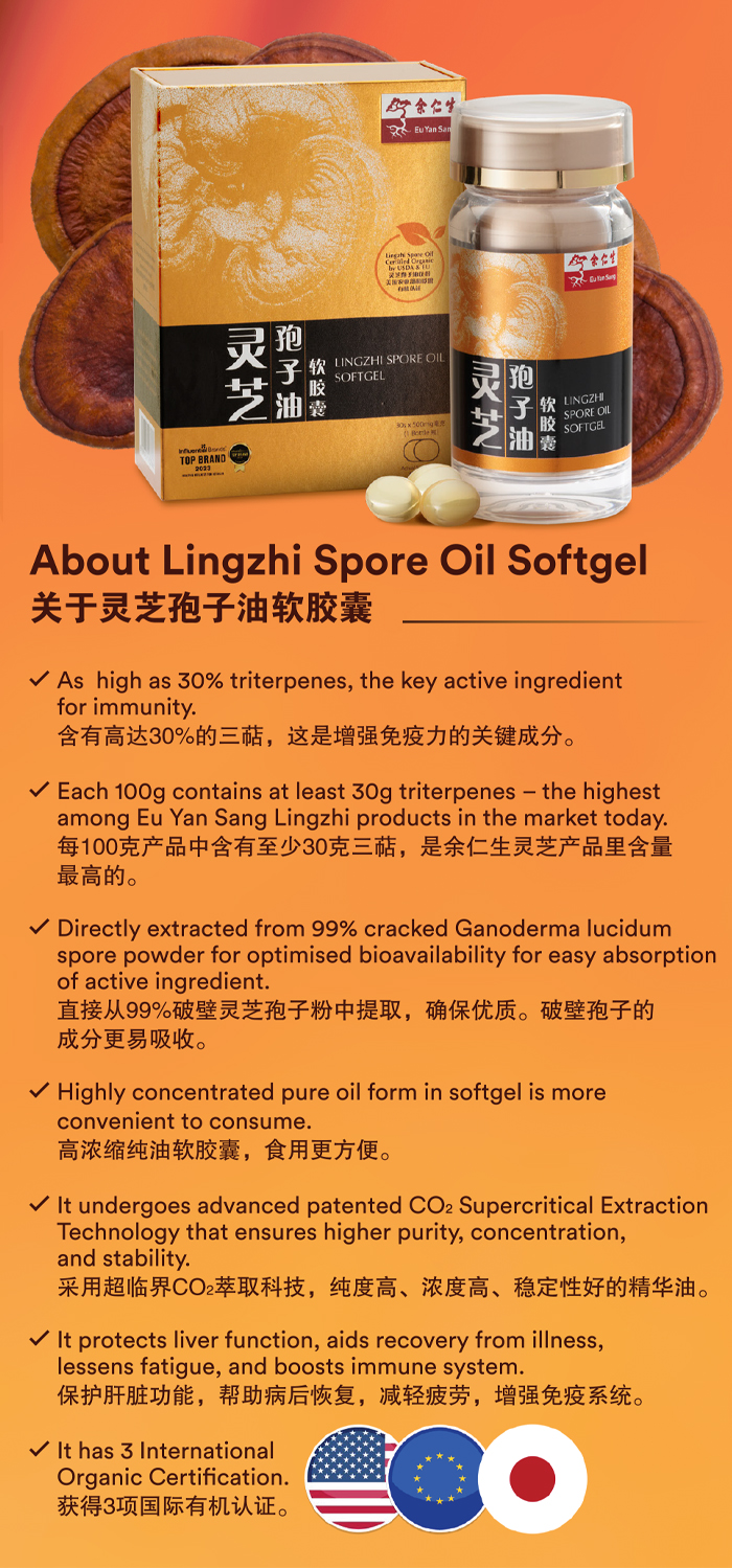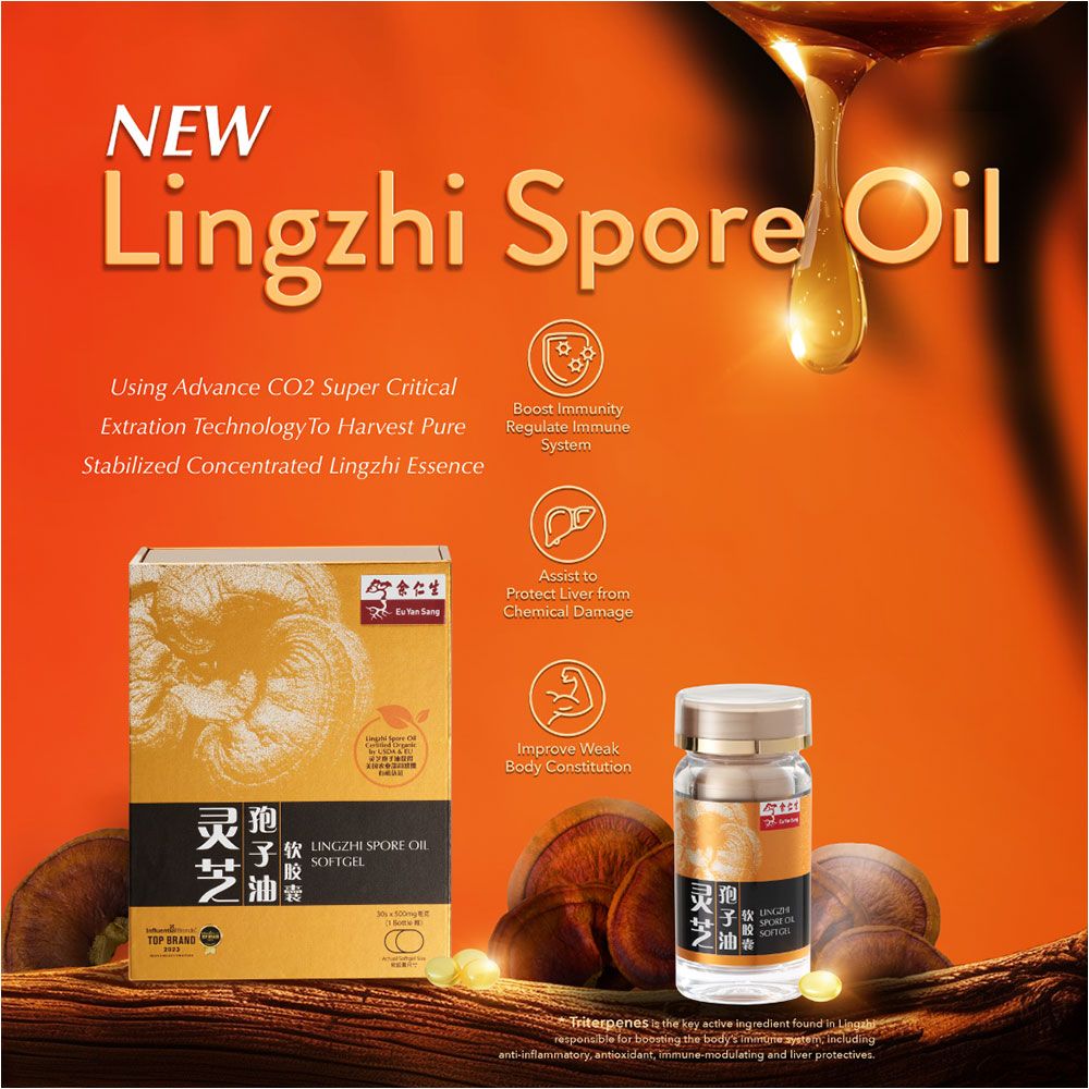 Via the advanced CO° super-critical extraction technology, Eu Yan Sang Lingzhi (Ganorderma Lucidum) Spore Oil Softgel is made of 100% spore oil extracted from the organic shell-cracked Ganoderma Lucidum spore powder from the Wuyi Mountains. This technology assures the shell cracking rate from Lingzhi spore powder of above 99%. The extracted Lingzhi Spore Oil is in higher purity and stability.
