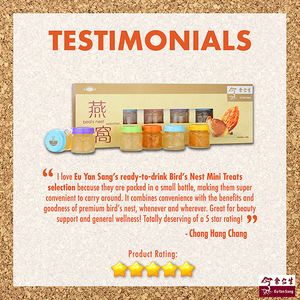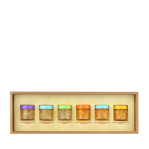 Eu Yan Sang Bird's Nest Mini Treats Selection 6s comprises of 3 different sugar levels of Premium and Imperial Concentrated Bird's Nest, with rock sugar, reduced sugar and sugar free. It is ready-to-drink, convenient to carry anywhere with you. Suitable for all ages by taking it chilled or warmed. Great as a gift or your own consumption in the comfort of your home.