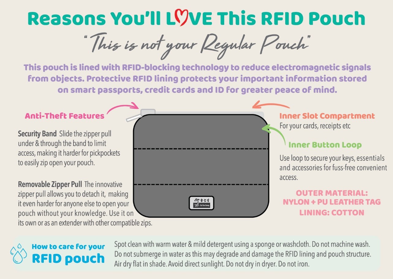 Three trendy colourways for you to choose from! Our multi-purpose #RFIDpoufy pouches come in Striking Orange, Sporty Dark Grey and Elegant Taupe, each comes with a surprise colour inner lining, which we’re sure will brighten up your day!
