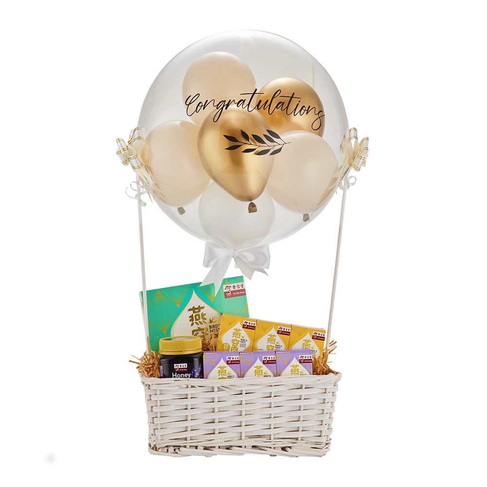 Celebrate your special moments with our exquisite Congratulations Bubble Balloon Hamper, designed to bring joy and elegance to any occasion. This beautifully curated hamper includes a trio of bird's nest collagen beverage in Original, Ginseng and Chia Seed flavour, offering a sophisticated taste experience that is both nourishing and indulgent. Complementing the Bird's Nest is a jar of honey infused with calming lavender which adds a touch of sweetness and imparts a soothing aroma and delicate flavour. This hamper is thoughtfully designed to convey your heartfelt congratulations with a blend of elegance and taste. It’s the perfect way to celebrate someone’s success or special occasion with a touch of luxury and cheer.