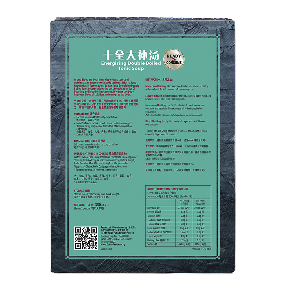 Qi and Blood are both inter-dependent source of nutients and energy to our body system. With its long known classic formulation, Eu Yan Sang Energising Double Boiled Tonic Soup provides the best combination for Qi boosting and blood enhancement. It warms the body, improves blood circulation and energises the body.