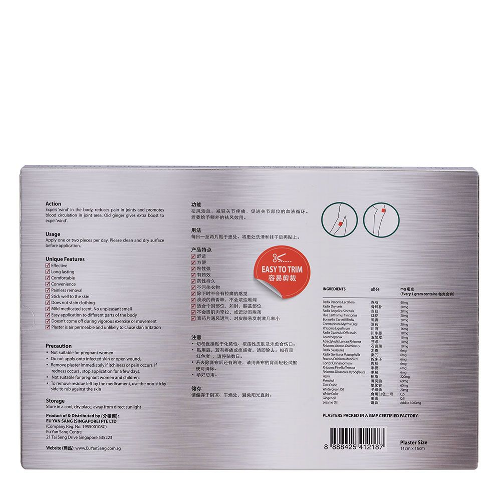 Eu Yan Sang Joint Pain Relief Herbal Plaster 10's expels ‘wind’ in the body, reduces pain in joints and promotes blood circulation in joint area after massage. Old ginger gives extra boost to expel ‘wind’. Eu Yan Sang Joint Pain Relief Herbal Plaster, expertly designed to provide targeted relief for joint pain and stiffness. Each pack contains herbal plasters that are perfect for addressing inflammation and promoting overall joint health.