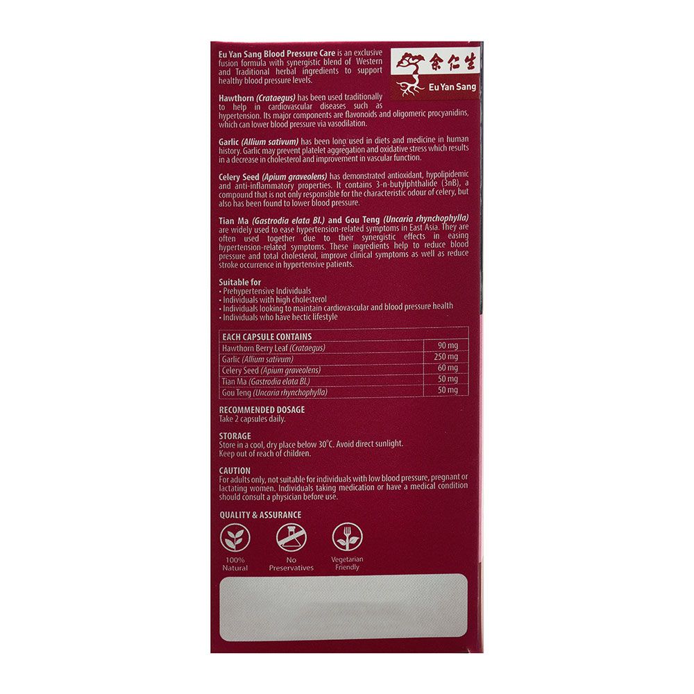 Eu Yan Sang Blood Pressure Care Capsules 60's is an exclusive fusion formula with synergistic blend of Western and Traditional herbal ingredients to support healthy blood pressure levels.