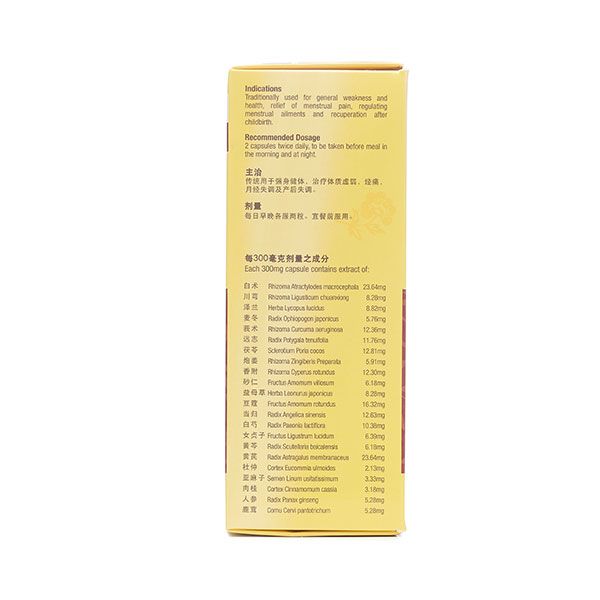 Indications: Traditionally used for general weakness and health, relief of menstrual pain, regulating menstrual ailments and recuperation after childbirth. This is a traditional medicine.