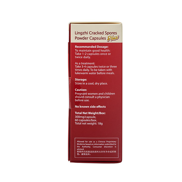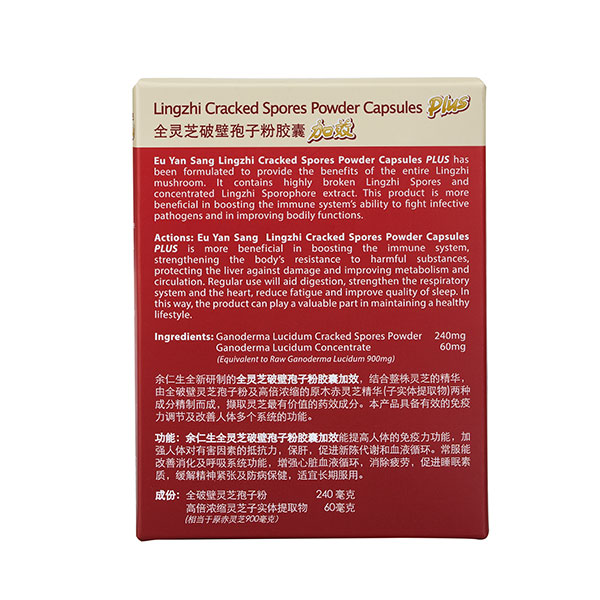 Eu Yan Sang Lingzhi Cracked Spores Powder Capsules PLUS, formulated with 100% pure Ganoderma Lucidum, is more beneficial in boosting the immune system, strengthening the body's resistance to harmful substances, protecting the liver against damage and improving metabolism and circulation. Regular use will aid digestion, strengthen the respiratory system and the heart, reduce fatigue and improve the quality of sleep.