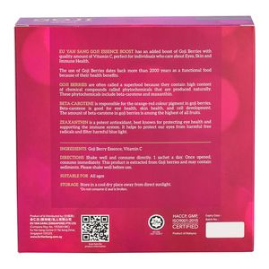 Eu Yan Sang GOJI Essence Boost 10's has an added boost of Goji Berries with quality amount of Vitamin C, perfect for individuals who care about Eyes, Skin and Immune Health. The use of Goji Berries dates back more than 2000 years as a functional food because of their health benefits.