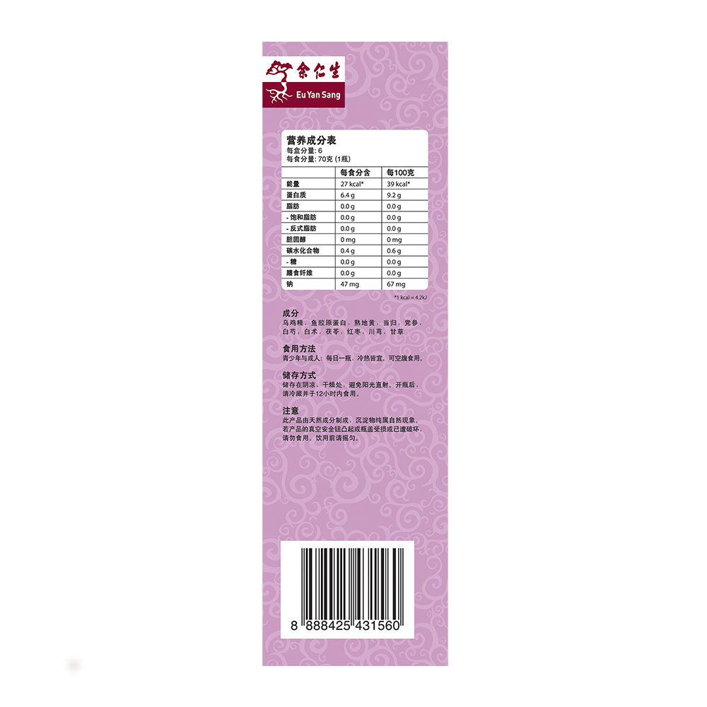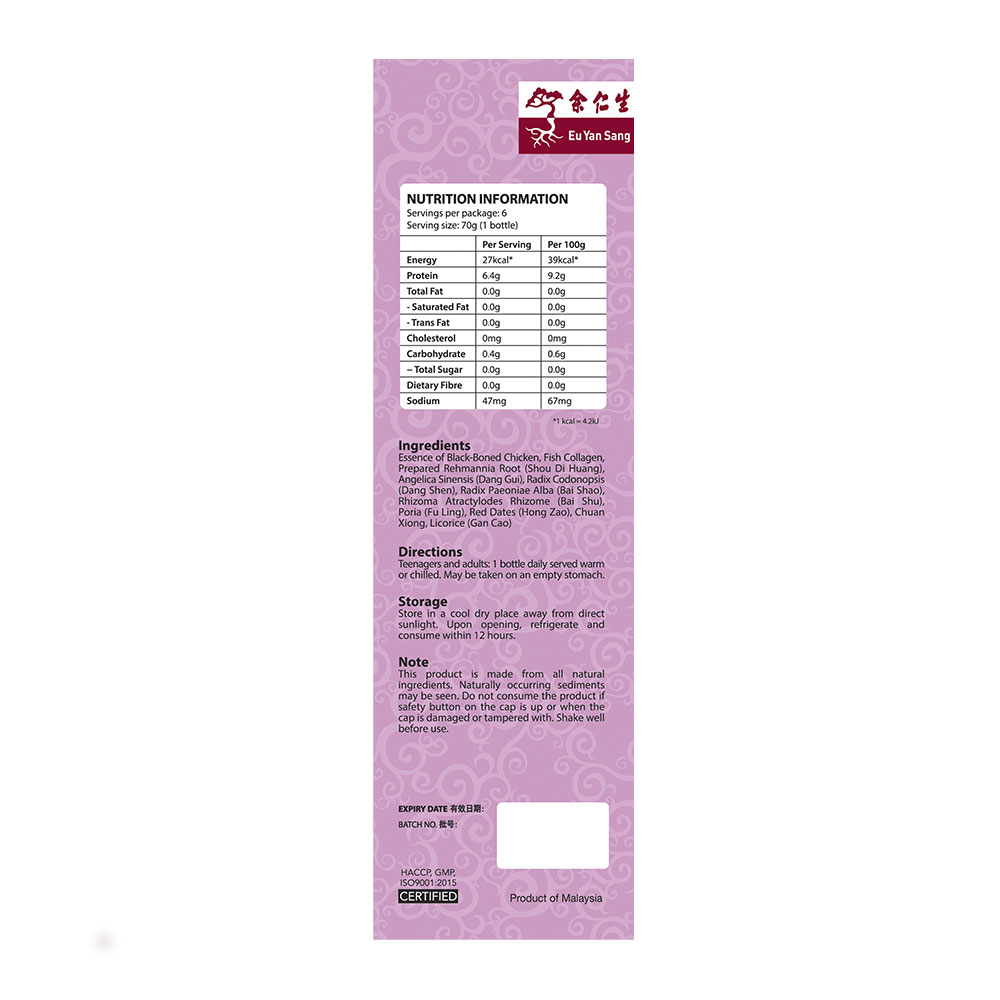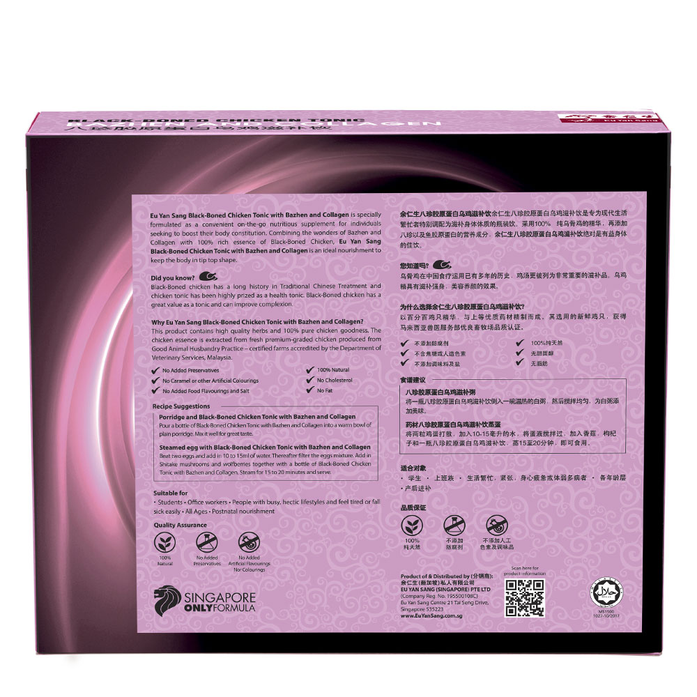 Eu Yan Sang Black-Boned Chicken Tonic with Bazhen and Collagen 6's is specially formulated as a convenient on-the-go nutritious supplement for individuals seeking to boost their body constitution. Combining the wonders of Ba Zhen and Collagen with 100% rich Essence of Black Boned Chicken. It is an ideal nourishment to keep the body in tip top shape.