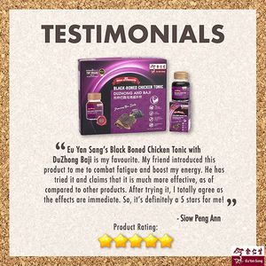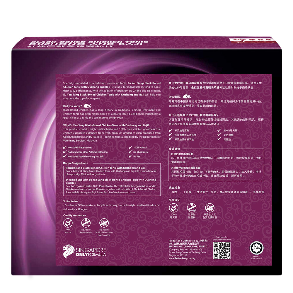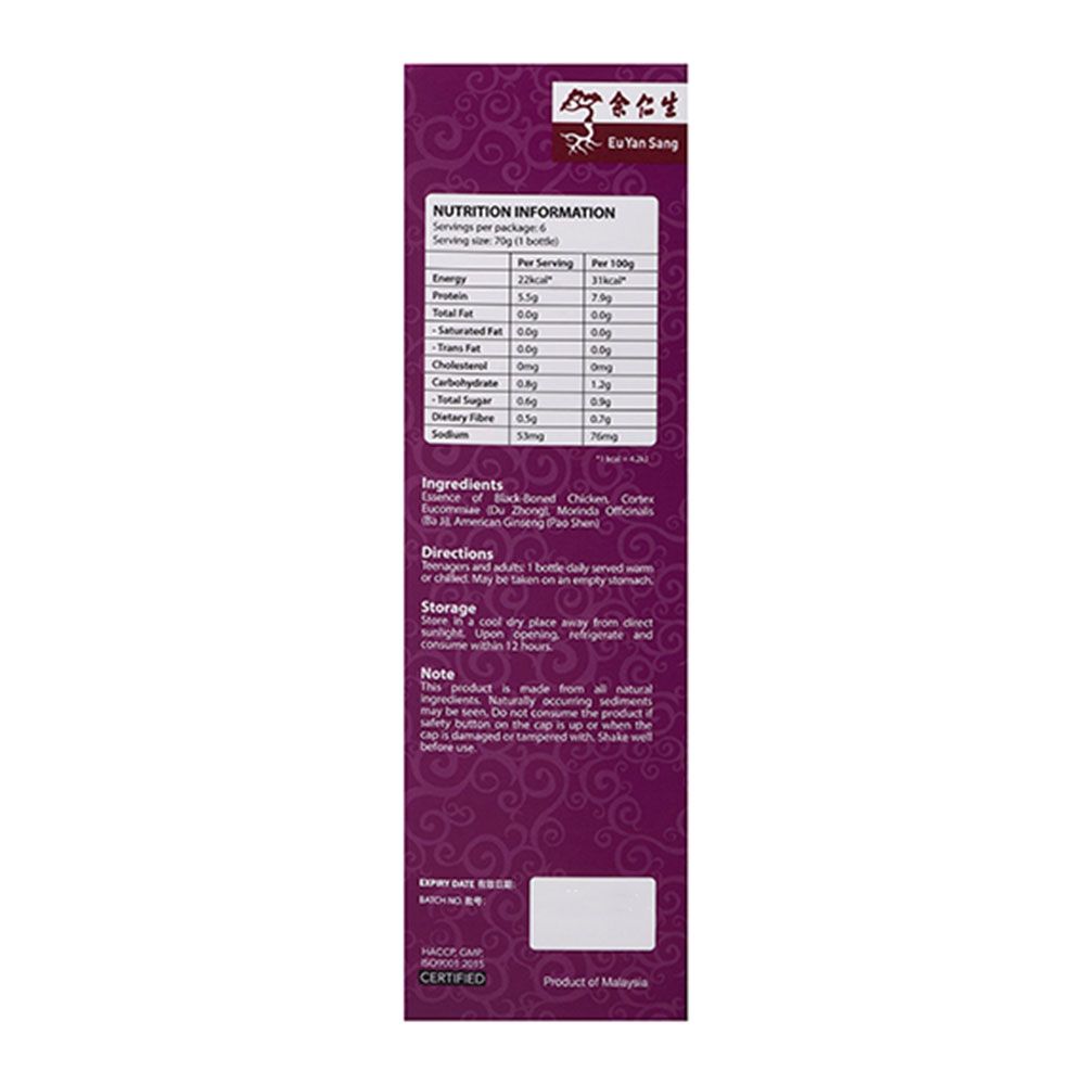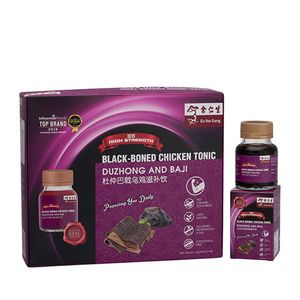 Eu Yan Sang Black-Boned Chicken Tonic with Duzhong and Baji 6's is suitable for individuals seeking to boost their daily performance. With addition of premium Du Zhong and Baji will help you stay on top of your game.