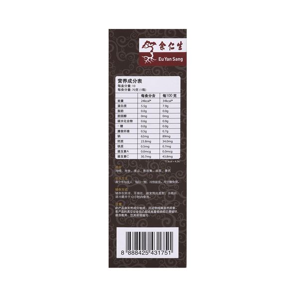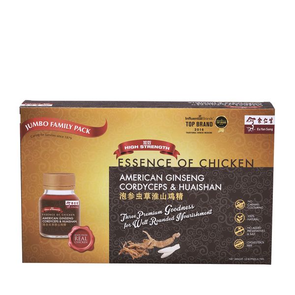 Made from premium graded chicken, only Eu Yan Sang gives you 100% pure Essence of Chicken with no caramel added. It is suitable for consumption by all ages and at all times, and can be taken chilled or warmed everyday.