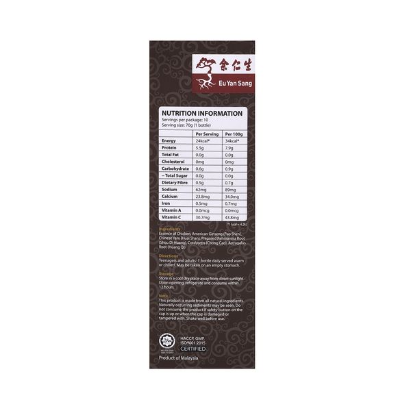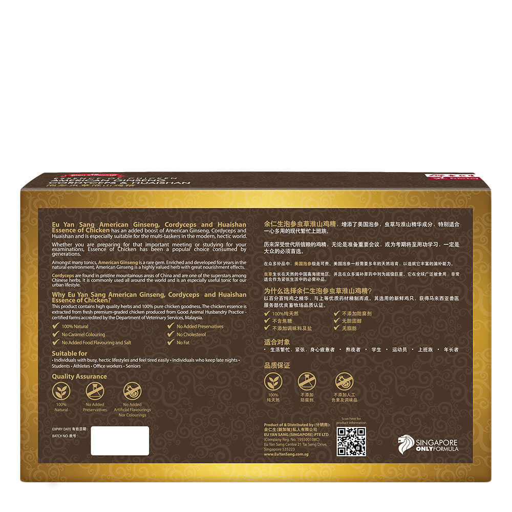 Eu Yan Sang Essence of Chicken with American Ginseng , Cordyceps & Huaishan uses modern technology to bring you superb convenience. You are now able to enjoy this full traditional nourishment without the hassle of long hours of cooking and preparation.
