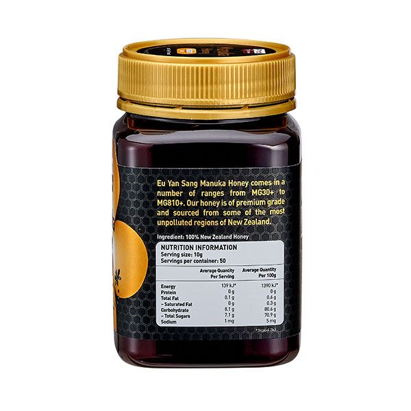Dark and creamy with a deep earthy aroma, Eu Yan Sang Manuka Honey MG 100+ Basic contains at least 100mg/kg of Methylglyoxal (MG).