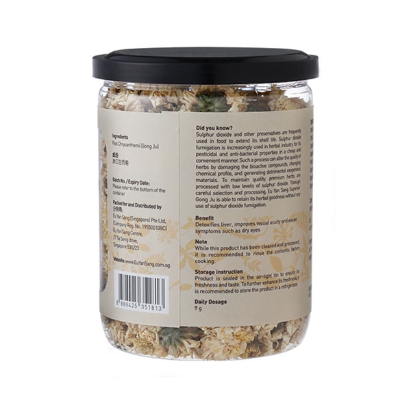 Sulphur dioxide and other preservatives are frequently used in food to extend its shelf life. Sulphur dioxide fumigation is increasingly used in herbal industry for its pesticidal and anti-bacterial properties in a cheap and convenient manner. Such a process can alter the quality of herbs by damaging the bioactive compounds, changing chemical profile, and generating detrimental exogenous materials. To maintain quality, premium herbs are processed with low levels of sulphur dioxide. Through careful selection and processing, Eu Yan Sang Superior Gong Ju is able to retain its herbal goodness without any use of sulphur dioxide fumigation.