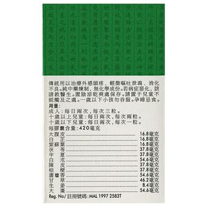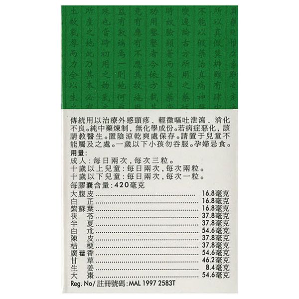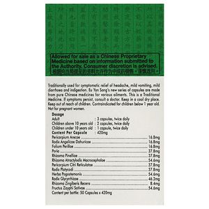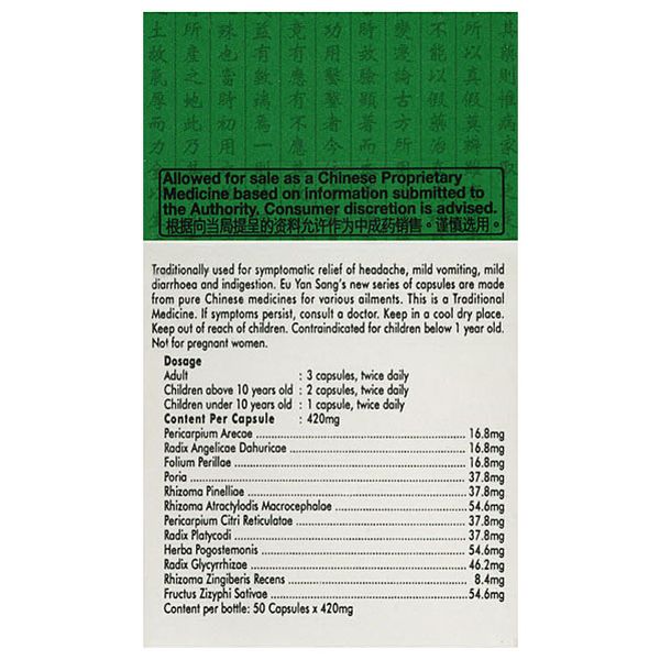 Traditionally used for symptomatic relief of headache, mild vomiting, mild diarrhoea and indigestion. Eu Yan Sang's new series of capsules are made from pure Chinese medicines for various ailments. This is a Traditional Medicine. If symptoms persists, consult a doctor. Keep in a cool dry place. Keep out of reach of children. Contraindicated for children below 1 year old. Not for pregnant women.