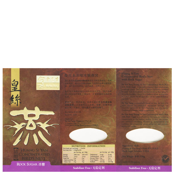 Eu Yan Sang Imperial Golden Concentrated Bird's Nest (Rock Sugar) is specially prepared from wholesome, premium grade bird's nest, which has been carefully selected and meticulously hand cleaned to best preserve its natural golden colour. It is ready-to-drink and suitable for consumption by all ages and can be taken chilled or warmed.