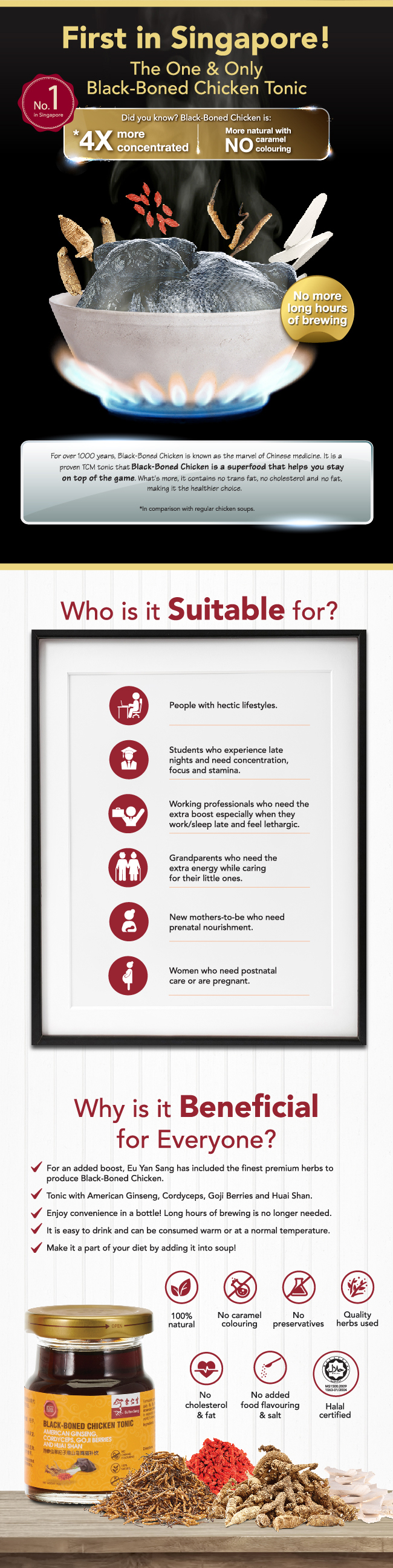 Complement your daily diet with Eu Yan Sang Black Boned Chicken Tonic with American Ginseng, Cordyceps, Goji Berries and Huai Shan, is especially suitable for multi-taskers in the modern, hectic world, to keep you ready for every situation in life.