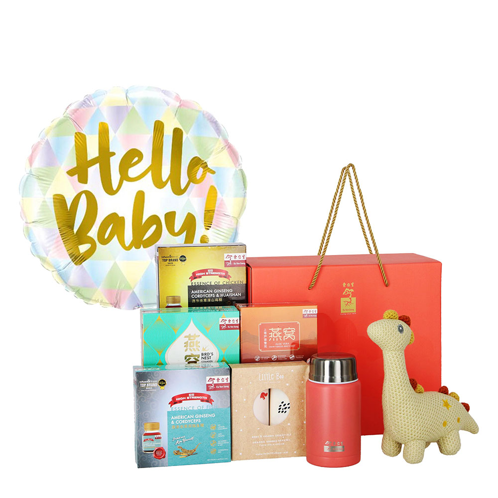 Introducing our delightful Mum & Baby Gift Set range, a perfect way to celebrate the arrival of a new little one! This Mum & Babe Gift Box C is a premium gift set with American Ginseng Essences of Chicken and Fish. Similarly, it features a cheerful "Hello Baby" balloon that adds a festive touch to any occasion. For the little bundle of joy, we’ve included an adorable dinosaur plushie, perfect for tiny hands to hold and love and an adorable Baby Onesie Twin Pack, offering two cozy and stylish outfits for those precious early days.