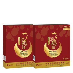 Eu Yan Sang Organic High-Protein Drip Chicken Essence with Cordyceps uses only Organic Certified chicken that are completely free of growth hormones, antibiotics or drugs. The chickens are freshly prepared within 30 minutes before being stewed for 8 hours at high pressure and heat. The result is a fragrant and delicious chicken soup that is highly nutritious and tastes great. It contains the highest protein level among all chicken essences, complete with 18 easily absorbed amino acids, and yet has zero fat and zero cholesterol. No additional water, colouring, flavouring, salt or preservatives are included.