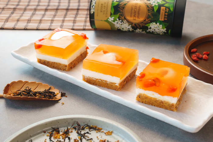Made with Eu Yan Sang’s Osmanthus Ruby Tea and Organic Barbary Wolfberries, this Osmanthus Lychee Jelly Cheesecake recipe is the perfect chilled dessert to end your meal on a good note! Eu Yan Sang’s Herbal Cookies Oatmeal with Goji was used as the base, but feel free to substitute with shortbread or graham crackers or your favourite cookie base.