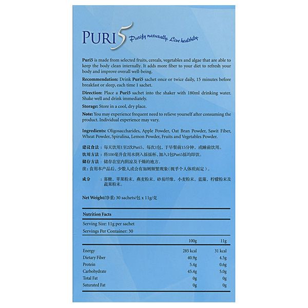 Made from a selection of vegetable and fruits powder with oligosaccharides and spirulina, Puri5 supplements your body with more fibre in your diet which is essential for a healthy digestive health and helps prevent weight gain.