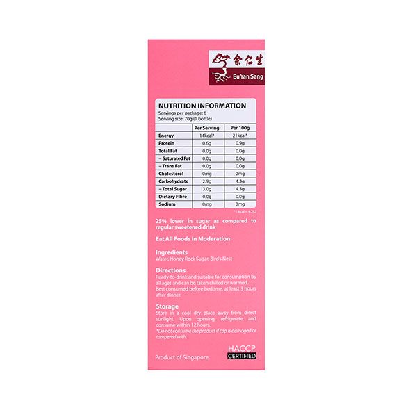 Every bottle of Eu Yan Sang Quality Bird's Nest with Rock Sugar (Reduced Sugar) provides the perfect gastronomical delight. It enhances recovery and promotes overall wellness. Formulated with 25% less sugar and packed with Epidermal Growth Factor, this is a great supplement that clears blemishes and keeps your skin looking radiant.