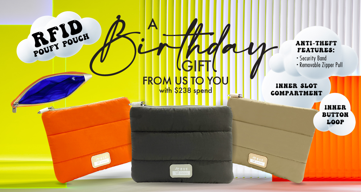 Exclusive for Eu Rewards members only on your birthday month, receive the #RFIDpoufy FREE as your birthday gift with $238 birthday purchase at any Eu Yan Sang stores.