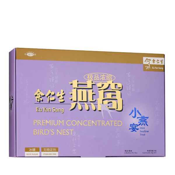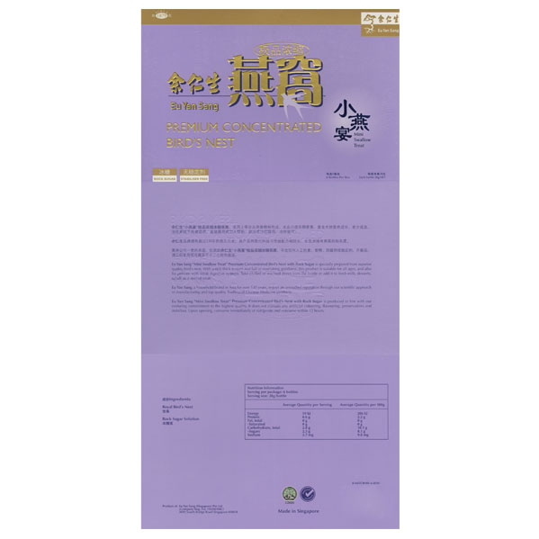 Eu Yan Sang Premium Concentrated Bird's Nest with Rock Sugar Mini Treats 6s is specially prepared from wholesome, premium grade bird's nest, which has been carefully selected and meticulously hand cleaned to best preserve its natural golden colour. It is ready-to-drink and suitable for consumption by all ages and can be taken chilled or warmed.