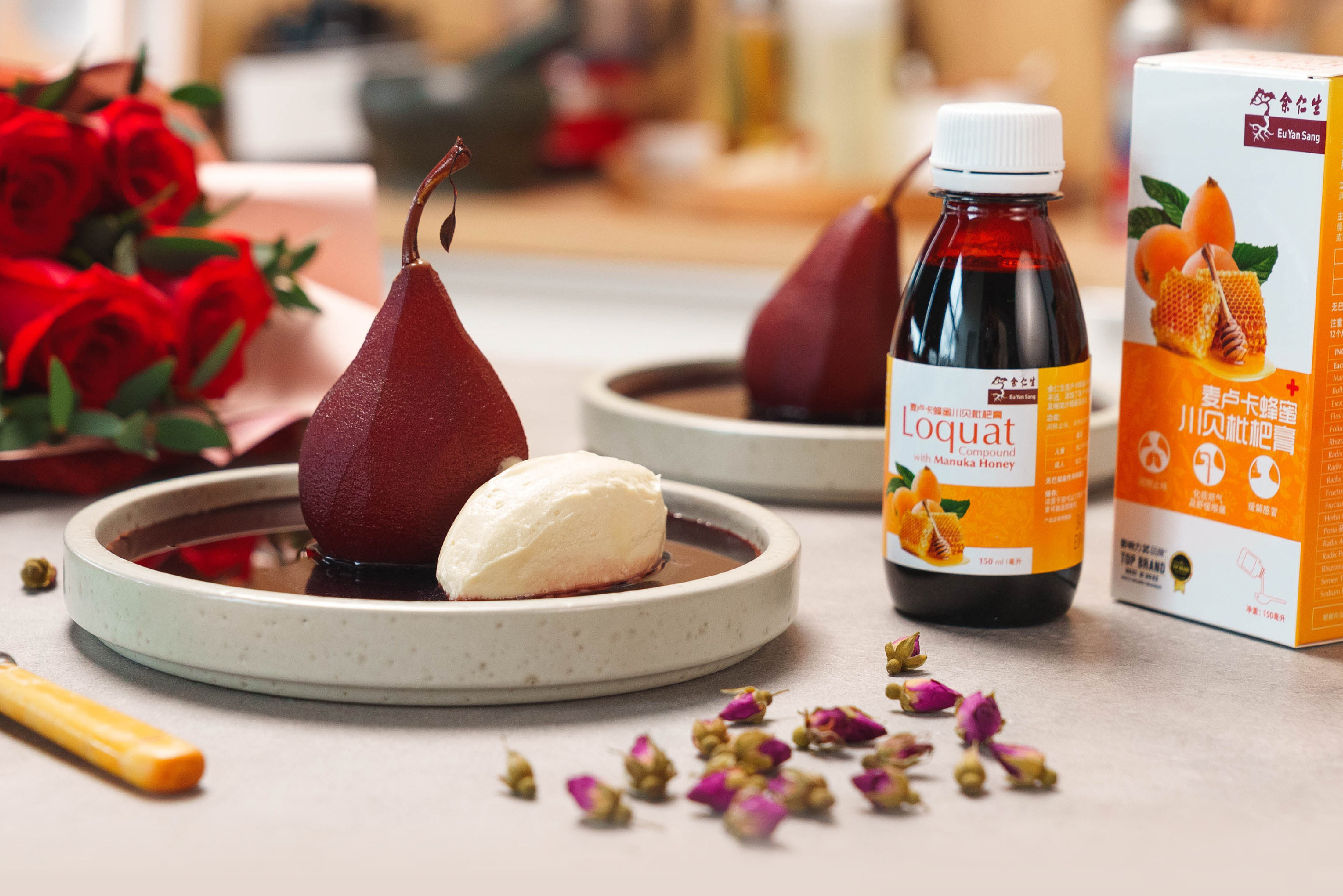 This dessert recipe is for anyone, no need for MasterChef skills. It may look extra fancy but is deceivingly easy to make! All you need is SIX ingredients (and decent plating skills) to have your special someone impressed and feeling super appreciated. Add a little bit more sweetness into their lives using Eu Yan Sang‘s Loquat Compound with Manuka Honey which nourishes the lungs and throat, Superior Mei Gui Hua 玫瑰花 (Dried Rose Flowers) that’s rich in Vitamin C and Organic Barbary Wolfberry Fruit for healthy eyes! The floral fragrant touch to this easy and nutritious Traditional Chinese Medicine-inspired poached pear recipe is sure to win hearts.