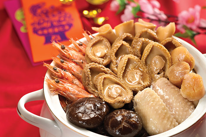 6. Place Tianjin cabbage into the serving pot with the rest of the ingredients, such as abalone, chicken and prawns, then add the hot sauce on top. Serve.