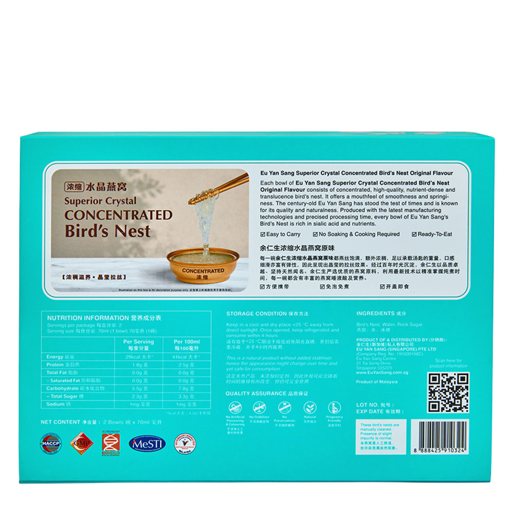 Each bowl of Eu Yan Sang Superior Crystal Concentrated Bird's Nest consists of concentrated, high-quality, nutrient-dense and translucence bird's nest. It offers a mouthfeel of smoothness and springiness. The century-old Eu Yan Sang has stood the test of times and is known for its quality and naturalness. Produced with the latest manufacturing technologies and precised processing time, every bowl of Eu Yan Sang's Bird's Nest is rich in sialic acid and nutrients.