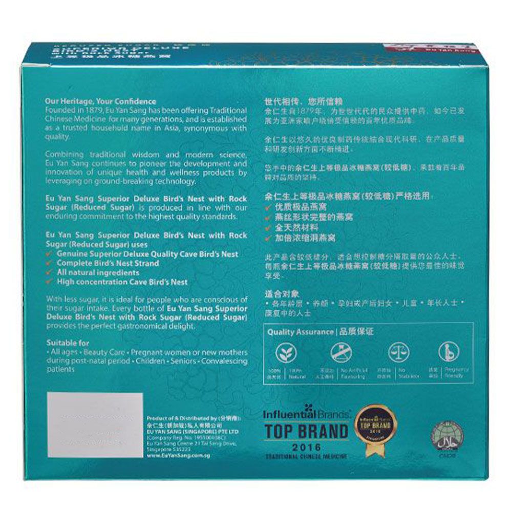 With less sugar, it is ideal for people who are conscious of their sugar intake. Every bottle of Eu Yan Sang Superior Deluxe Bird's Nest with Rock Sugar (Reduced Sugar) provides the perfect gastronomial delight.