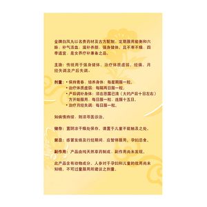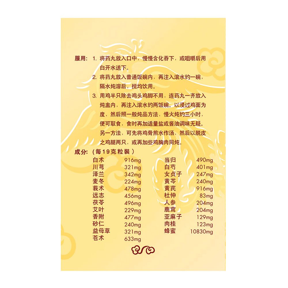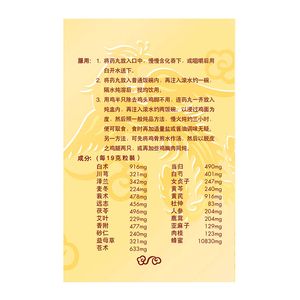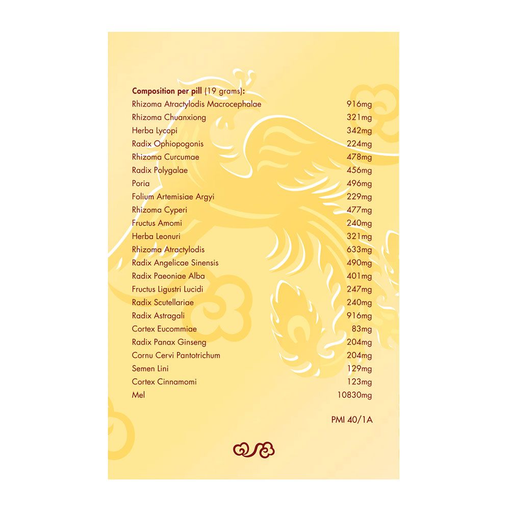 Rhizoma Atractylodes macrocephala 916mg Rhizoma Ligusticum chuanxiong 321mg Herba Lycopus lucidus 342mg Radix Ophiopogon japonicus 224mg Rhizoma Curcuma aeruginosa 478mg Radix Polygala tenuifolia 456mg Poria cocos 496mg Folium Artemisia argyi 229mg Rhizoma Cyprus rotundus 477mg Fructus Amomum villosum 240mg Herba Leonurus japonicus 321mg Rhizoma Atractylodes lancea 633mg Radix Angelica sinensis 490mg Radix Paeonia lactiflora 401mg Fructus Ligustrum lucidum 247mg Radix Scutellaria baicalensis 240mg Radix Astragalus membranaceus 916mg Cortex Eucommia ulmoides 83mg Radix Panax ginseng 204mg Cornu Cervi pantotrichum 204mg Semen Linum usitatissimum 129mg Cortex Cinnamomum cassia 123mg Mel 10,830mg